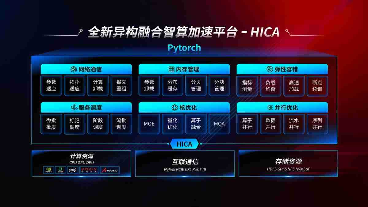 通过自研的服务层、、中间适配层、、、、以及调度编排算法,,采用数据并行、、、模型并行等多种并行方式,,,把并行计算任务进行有效的分解,,,使其分别由相应的软件栈和算力资源来承接。。。。当GPU资源变化,,HICA可以实时动态调度计算子任务并调整模型拓扑和架构,,以充分聚合各种算力资源。。。