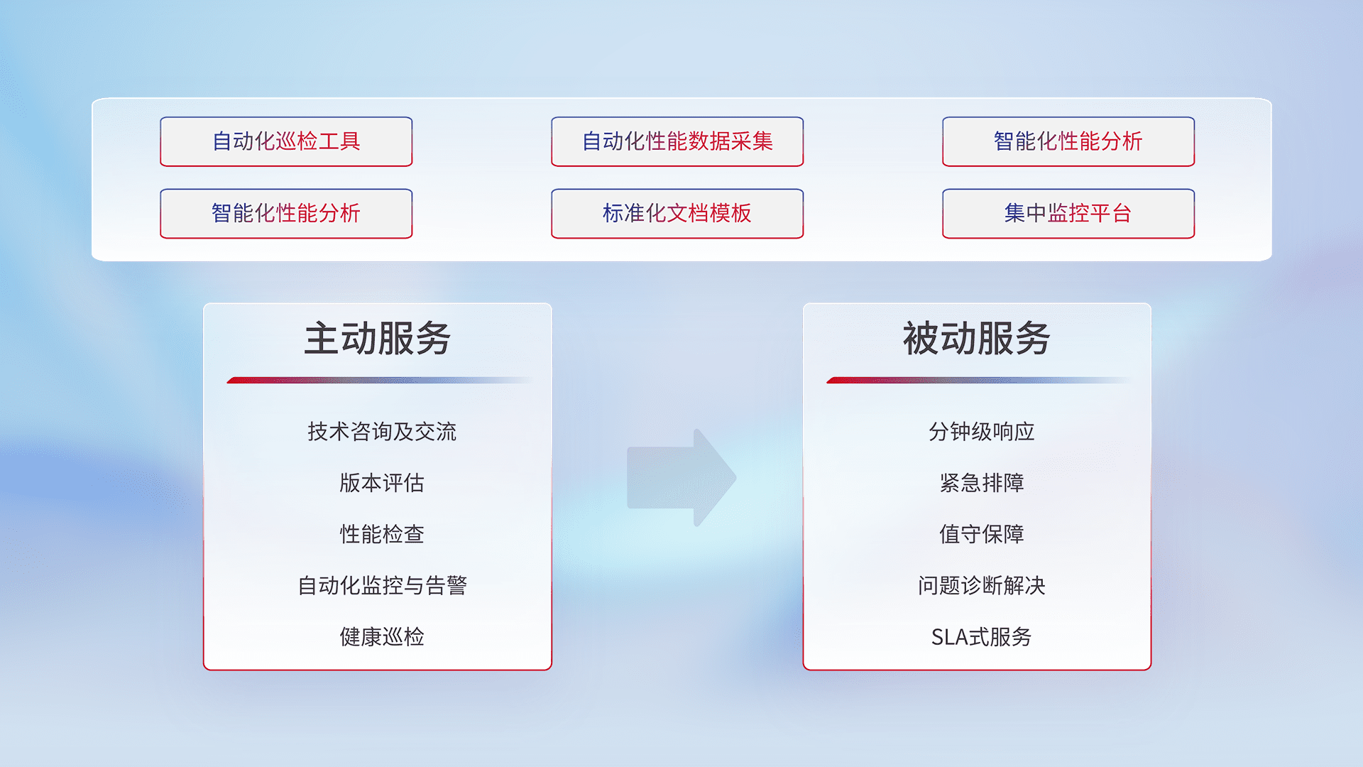 智能化工具和标准化文档,,,,保障服务质量,,提供主动服务(包含技术咨询、、、版本评估、、、性能检查、、自动化监控与告警、、、健康巡检)和被动服务包含(分钟级响应、、、、紧急排障、、、值守保障、、、、问题诊断解决、、、SLA服务)。。